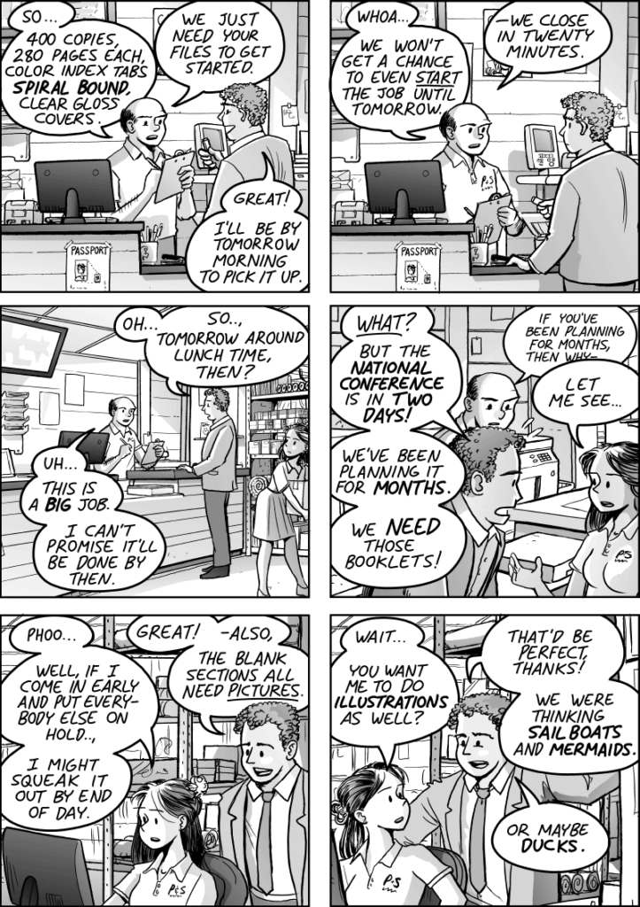 Very often, it was easy for the folks in the sales department, (in their fancy suits and snappy haircuts, zooming in and out like wunderkind), to not realize just how much fiddly nonsense was required to meet even a simple request. (Though honestly, our sales reps were much loved and admired as we worked to support their efforts. They pulled in the cash which saw everybody getting paid, after all. But sometimes.., it felt like babysitting!)